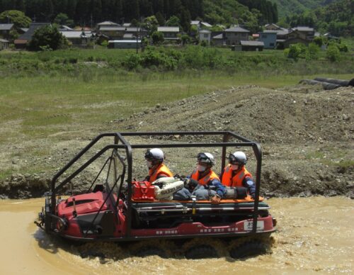 車両には、浸水地域や瓦礫が散乱した場所でも活動できるよう、水陸両用バギーやボート、ウエットスーツなどが積載してあり、冠水地域で消防力が発揮できる仕様となっております。