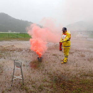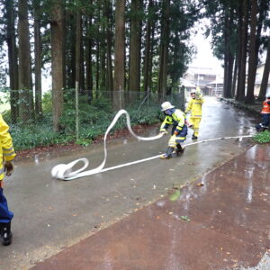 用水路から吸水し、各部が連携して中継放水訓練を実施しました。雨が降り足元も悪い中でしたが組織化された指揮命令系統のもと安全・確実・迅速な活動が行われていました。