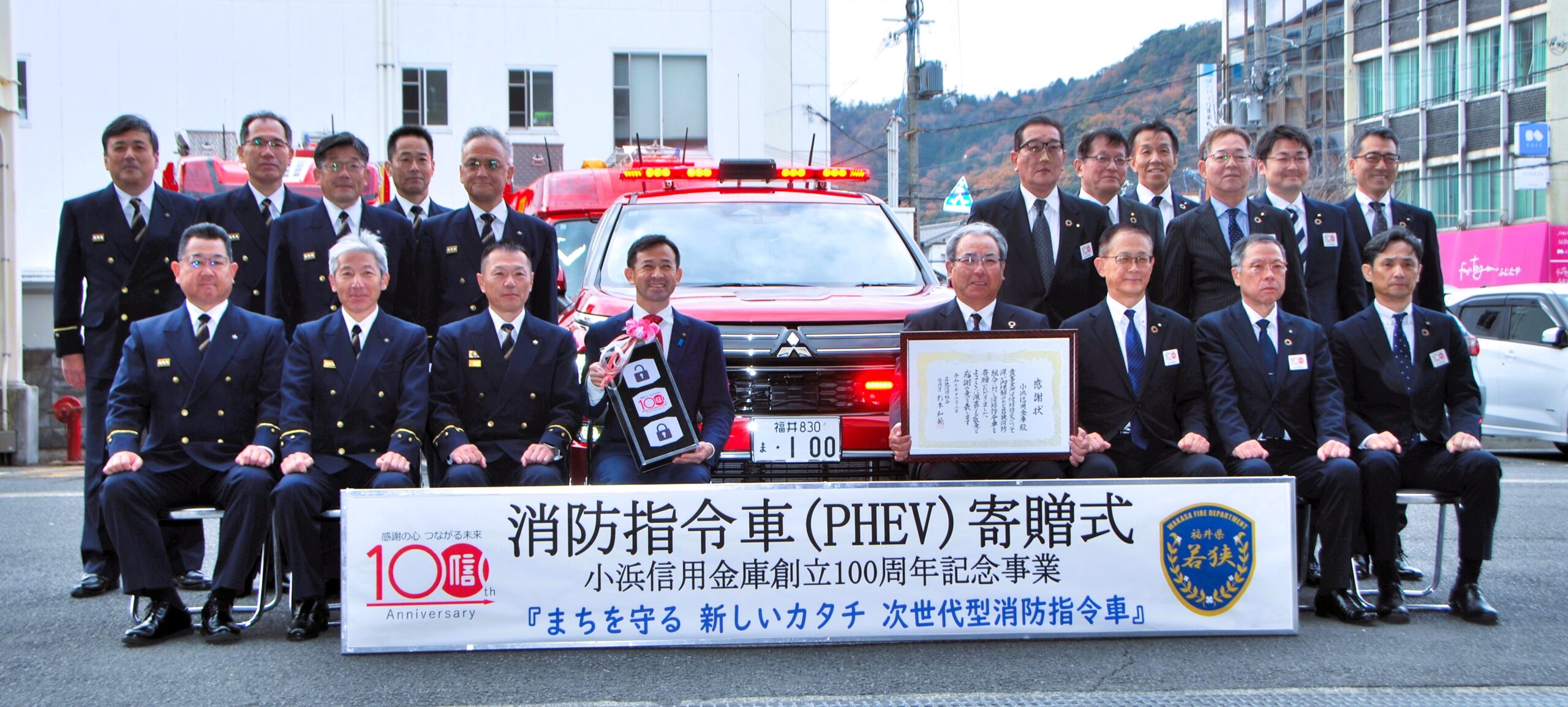 この寄贈式は、今年、創立100周年を迎えられました小浜信用金庫様より、その記念事業として、若狭消防組合へ消防指令車寄贈の申し出をいただき、本日寄贈式をとり行う運びとなったものです。