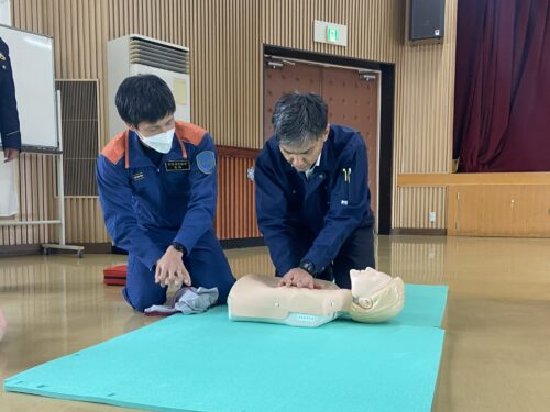 受講者は一つ一つの手技を確認しながら真剣に取り組み、救急事案発生時における迅速かつ的確な初動対応の重要性を再認識していました。昨年は警防特別訓練を合同で実施し、本年は救急講習を通じて連携強化を図ったもので、今後も関係機関との連携を一層深め、地域の安全・安心の確保と救命率の向上に努めてまいります。