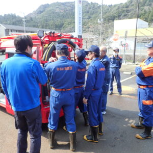 式典の終了後、納入業者の方から車両や小型動力ポンプ等の操作方法の説明を受けました。