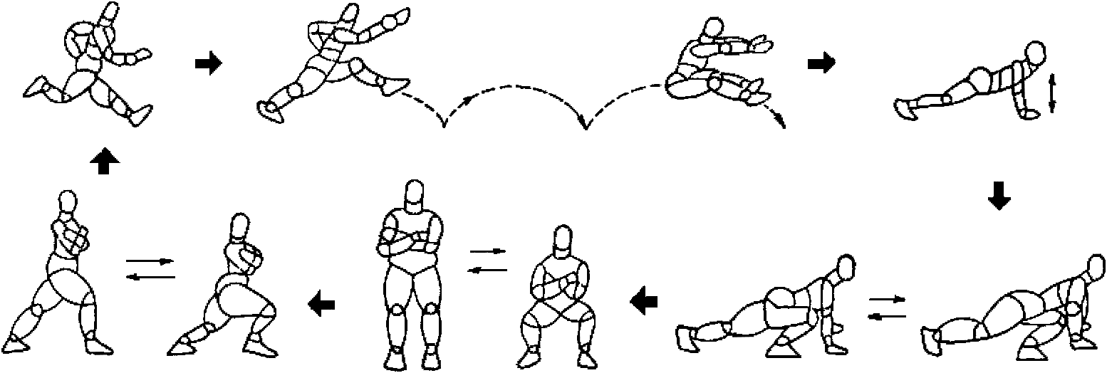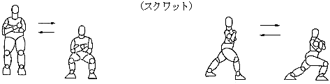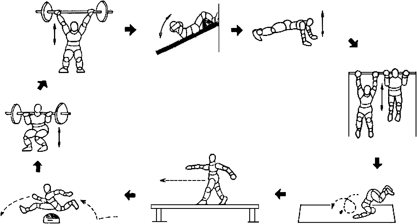 | サーキットトレーニング | 柔軟性、筋力、筋持久力、心肺持久力のほか、敏しょう性、平衡性等体力要素全部 | 一連の種目を組み合わせて設定しておき次々に実施していく。 | ![]() |