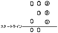 | ○両足をそろえてかかとをつけ、足先を約5センチメートル開いて台上に立つ。 | ○踏切りライン上に立ち、その場から両足で踏み切って、きき足で跳び、更に逆足で跳び、両足で着地する。 | ○スタートラインに立ち、「用意・始め」の合図でS1~S2に走り、S2の外側のタッチラインに片手を触れ、直ちにS1に引き返す。以後S1~S2~S1~S2と同様にタッチを繰り返す。 | ○30キログラムのバーベルを使用。いすに腰をおろす。 | ○陸上方式のトラックに10メートル間隔に印をつける。 | ○背筋力計の台の上に両足先を15センチメートルぐらい離して立ち、ひざを伸ばしたまま背筋力計のハンドルを順手で握り、背を伸ばして上体を30度前方に傾ける。 | ○仰臥姿勢で、両足を肩幅に開き、ひざを90度に曲げ、後頭部に手を置く。 | ○肩幅の広さで、順手でぶら下がる。 | |