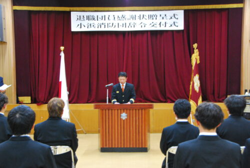 退職消防団員感謝状贈呈式では、令和8年3月31日をもって若狭消防組合小浜消防団を退団した団員に対して、感謝状を授与しました。永年にわたり消防団活動に従事されました皆様へ、心より感謝の意を申し上げます。