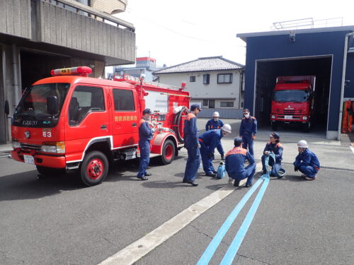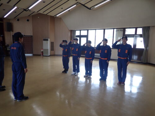 消防団の活動内容についての座学を始め、気を付け、敬礼などの訓練礼式やホースの取扱い訓練を実施しました。消防団員は戸惑いながらも技術を習得し、消防団員として一歩を踏み出しました。